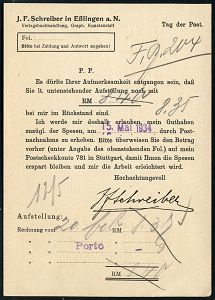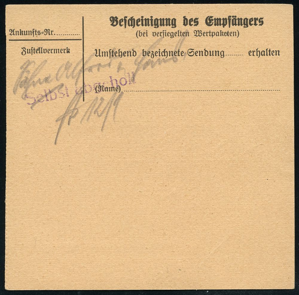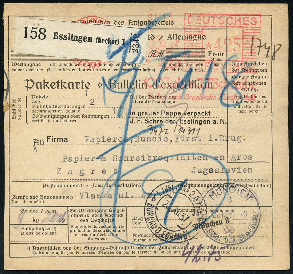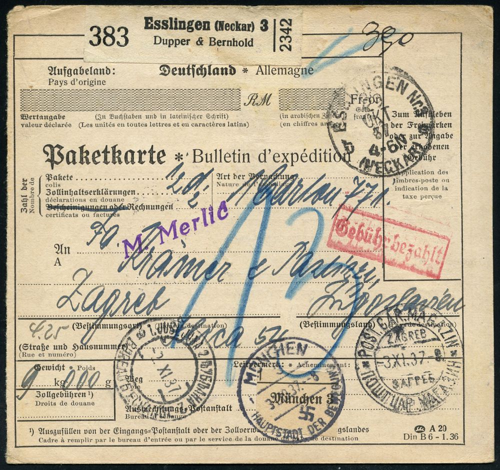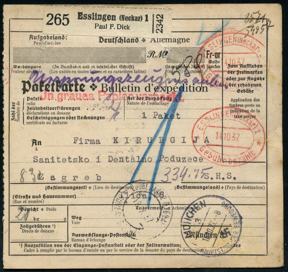 4439 | 30 € | 7300 ESSLINGEN : ESSLINGEN (Neckar) 1/ **/ Gebühr bezahlt 1937 (14.10.) Doppeloval-PFS 2x + schw. Selbstbucher-Paketzettel: Esslingen (Nackar) 1/ Paul F. Dick (= Stahl- u. Metallwarenfabrik, vergl. Kat.-Nrn. 4446, 4452-53) + TS München 3, Ausl.-Selbstbucher-Paket-Kt. (kl. Kerbe) n. Zagreb, rs. jugosl. Tax- u. Fiskalmarken (Dü.A-5, Nr.20) | ![]() ![]() | |