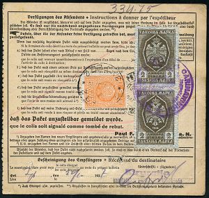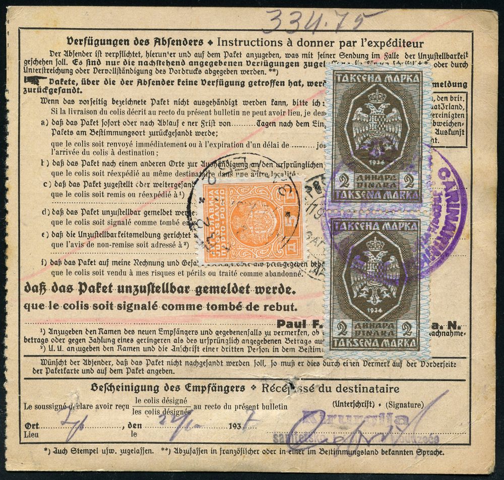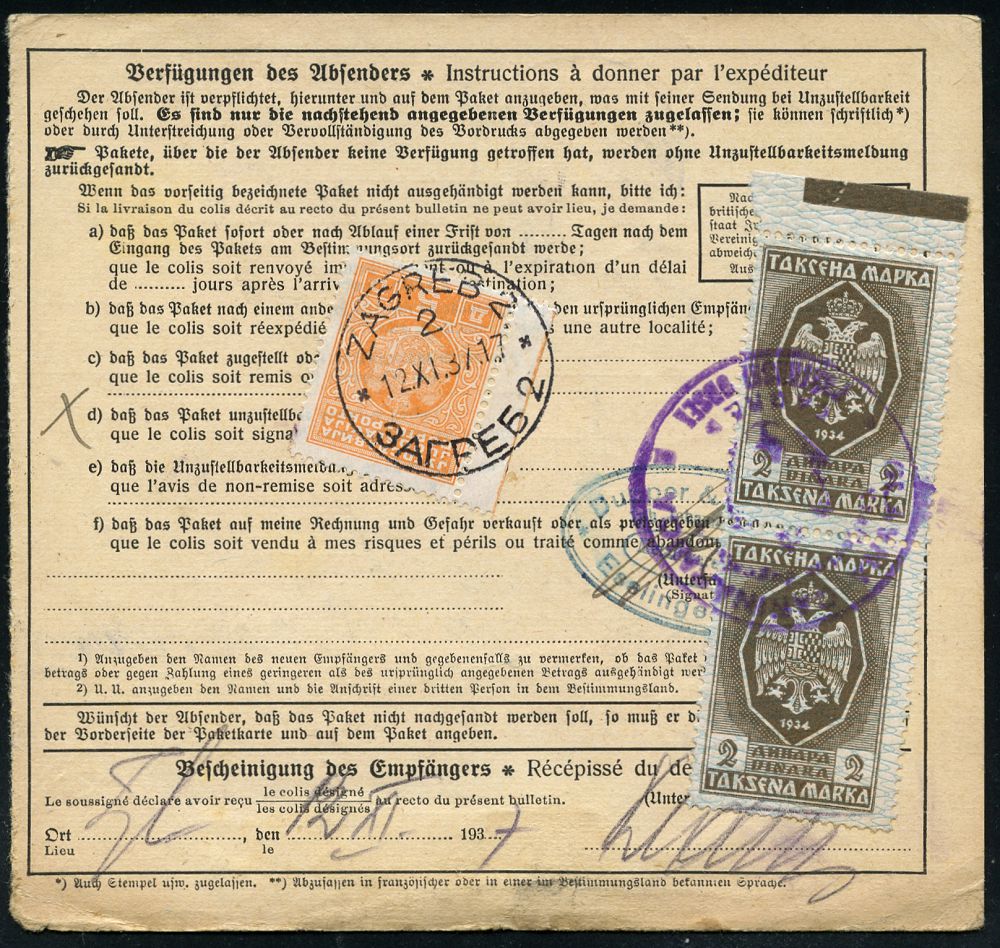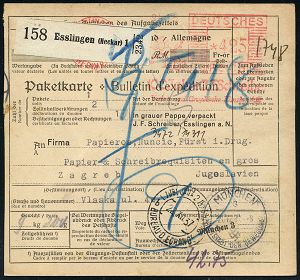 4440 | 30 € | 7300 ESSLINGEN : ESSLINGEN Nr.3/ B */ (NECKAR) 1937 (29.10.) 1K + roter Ra.: Gebühr bezahlt + schw. Selbstbucher-Paketzettel: Esslingen (Neckar) 3/ Dopper & Bernhold , klar gest. Ausl.-Selbstbucher-Paket-Kt. n. Zagreb, rs. jugoslaw. Tax- u. Fiskalmarken! | ![]() ![]() | |