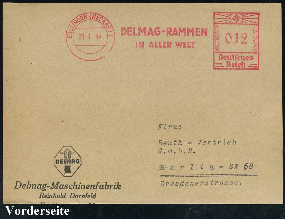 4445 | 15 € | 7300 ESSLINGEN : ESSLINGEN (NECKAR) 1/ DELMAG-RAMMEN/ IN ALLER WELT 1939 (20.9.) AFS Francotyp "Hakenkreuz" auf Firmen-Vorderseite: Delmag-Maschinenfabrik, Reinhold Dornfeld (Dü.E-3CEo) | ![]() | |