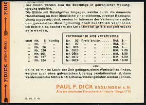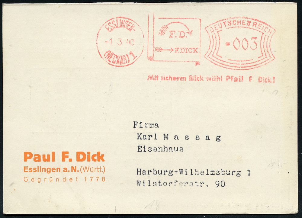 4446 | 18 € | 7300 ESSLINGEN : ESSLINGEN/ (NECKAR) 1/ F.D.DICK/ Mit sicherem Blick.. 1940 (1.3.) AFS Francotyp "Bogenrechteck" (Firmenlogo: 2 Pfeile) halbe Reklame-Kt.: Paul F. Dick (Stahl-, Messing u. Leichtmetallfabrik) n. Hamburg (Dü.E-1Ao mit Punkt) | ![]() ![]() | |