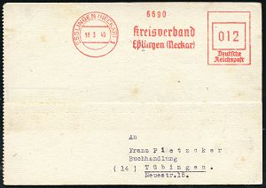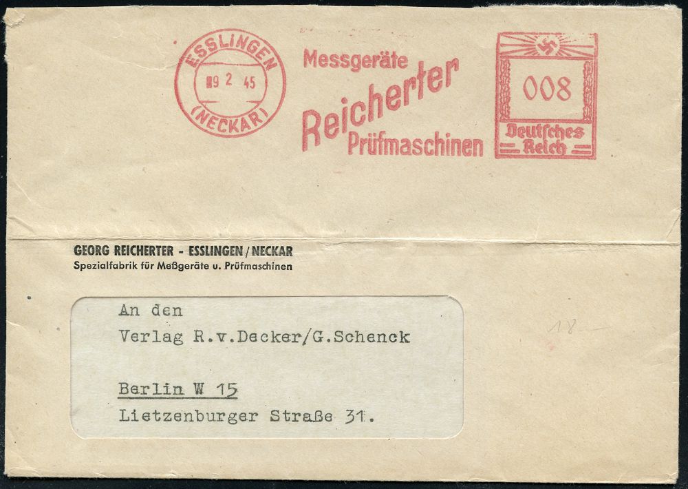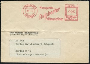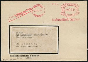 4447 | 18 € | 7300 ESSLINGEN : ESSLINGEN/ (NECKAR) 1/ Messgeräte/ Reicherter/ Prüfmaschinen 1945 (9.2.) AFS Francotyp "Hakenkreuz" , später Firmen-Bf.: GEORG REICHERTER.. (Querfalte) klar gest.! (Dü.E-3CEo) | ![]() | |