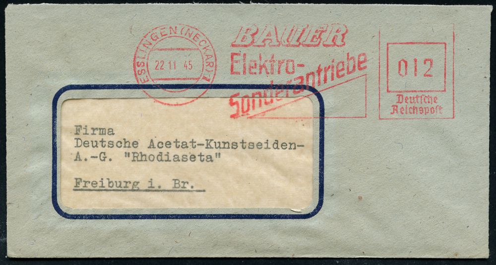 4448 | 28 € | 7300 ESSLINGEN : ESSLINGEN (NECKAR) 1/ BAUER/ Elektro-/ Sonderantriebe 1945 (22.11.) aptierter AFS Francotyp "Reichsadler" = entfernt = Notmaßnahme! , rs. Abs.-HdN, kleiner Fern-Bf., vergl. Kat.-Nr. 4435 (Dü.E.13 J-129o) | ![]() ![]() | |