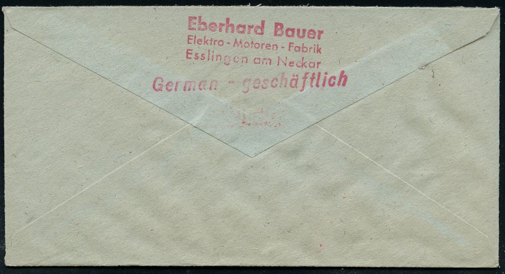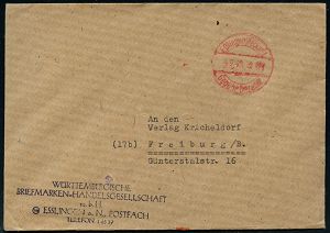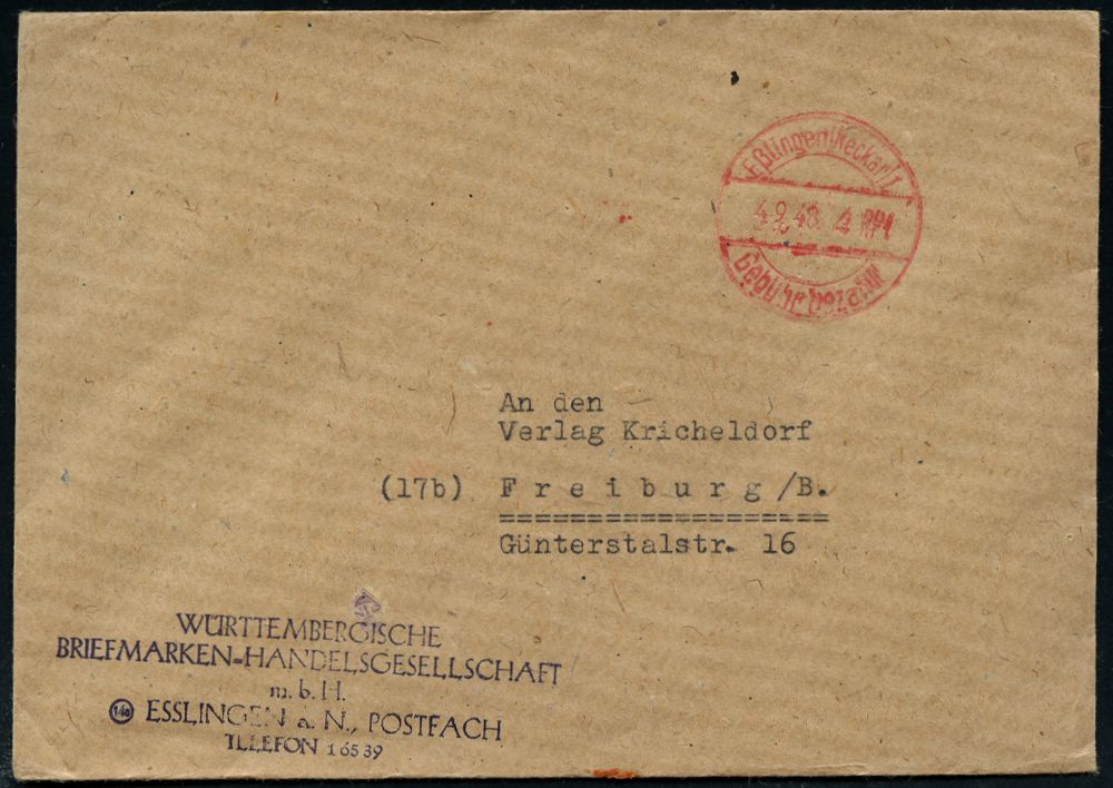 4457 | 20 € | 7300 ESSLINGEN : ESSLINGEN/ (NECKAR)/ 1/ HERMANN/ ULRICH/ ..J.WAIMER 1946 (8.7.) aptierter AFS Francotyp "Reichsadler" = entfernt = Notmaßnahme! , Firmen-Fern--Bf. (links gefaltet) vs. Abs.-Vordruck (Dü.E-13 J-127o) | ![]() | |