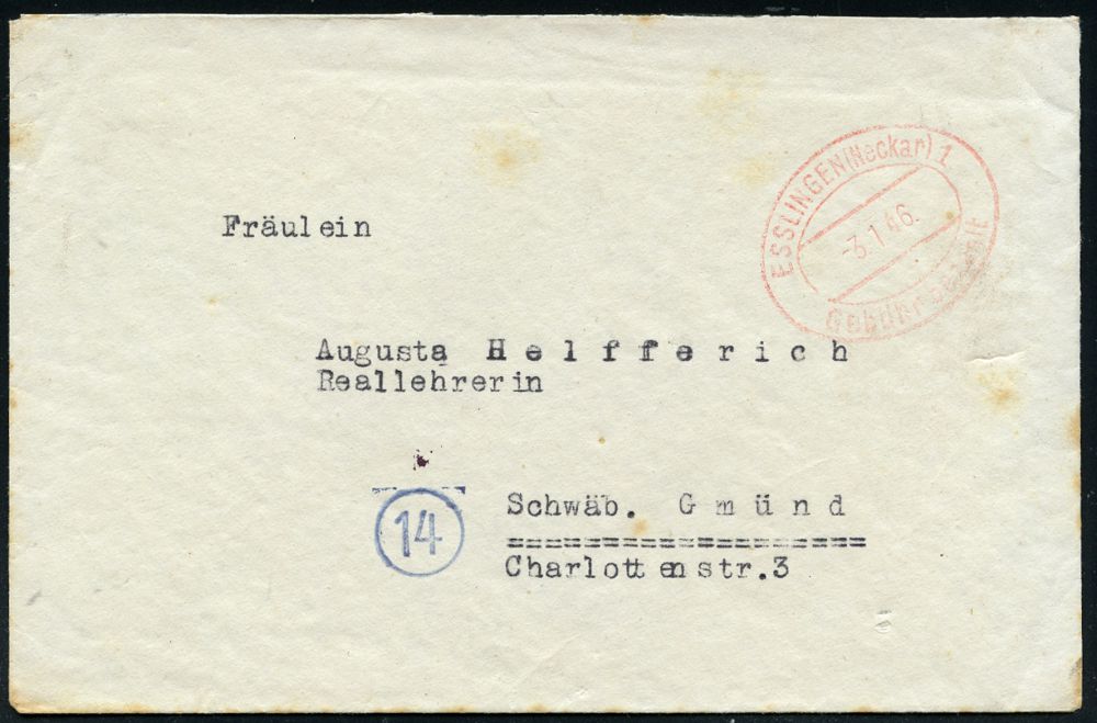 4450 | 14 € | 7300 ESSLINGEN : ESSLINGEN (Neckar) 1/ Gebühr bezahlt 1946 (3.1.) Doppeloval-PFS = Schalter-Freistempel , Fern-Bf. n. Schwäb. Gmünd (Dü.A-5, Nr.20) | ![]() | |