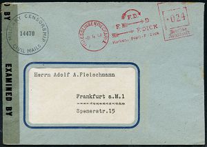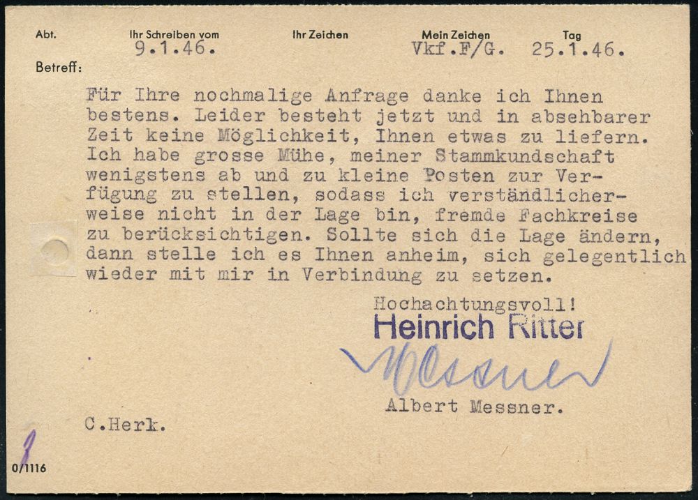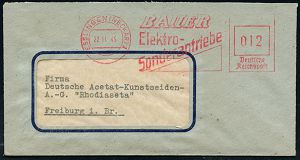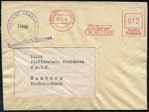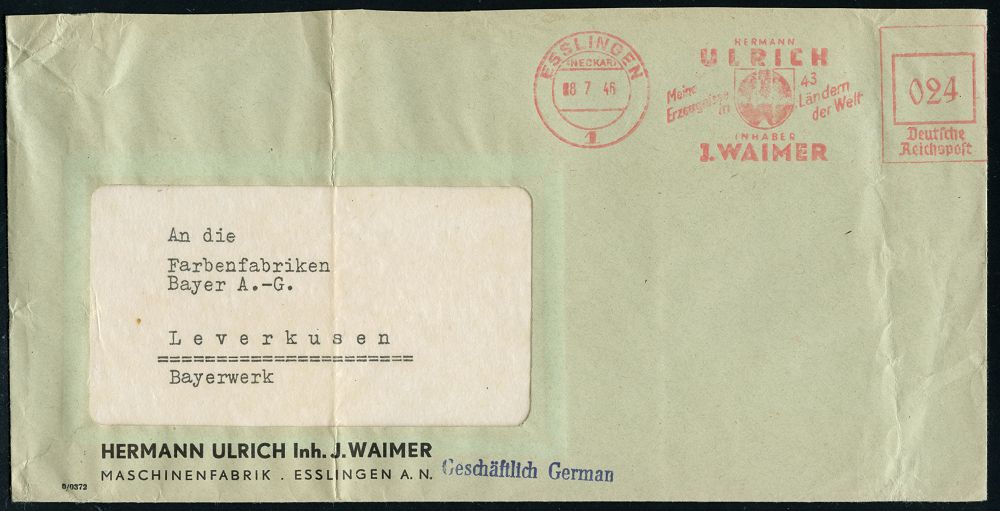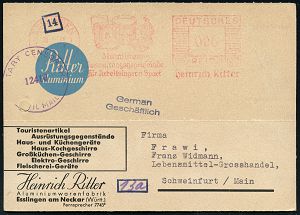 4451 | 22 € | 7300 ESSLINGEN : ESSLINGEN/ (NECKAR) 1/ Aluminium../ Heinrich Ritter 1946 (28.1.) AFS Francotyp "Mäanderrechteck" 006 Pf. unverändert weiterverwendet mit Inschrift "DEUTSCHES REICH" = Notmaßnahme! + viol. Zensur-1K: MILITARY CENSORSHIP/ 12410/CIVIL MAILS (= US-Zensurstelle Esslingen) Firmen-Kt.: Ritter Aluminium (1x Reg.-Loch geschl.) mit Text über Mangellage u. nicht leferbar sWare, n. Schweinfurt (Dü.E-2CEo, unverändert) | ![]() ![]() | |