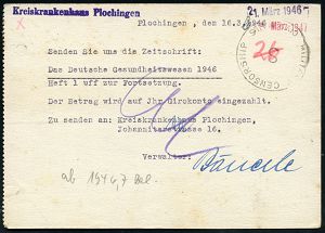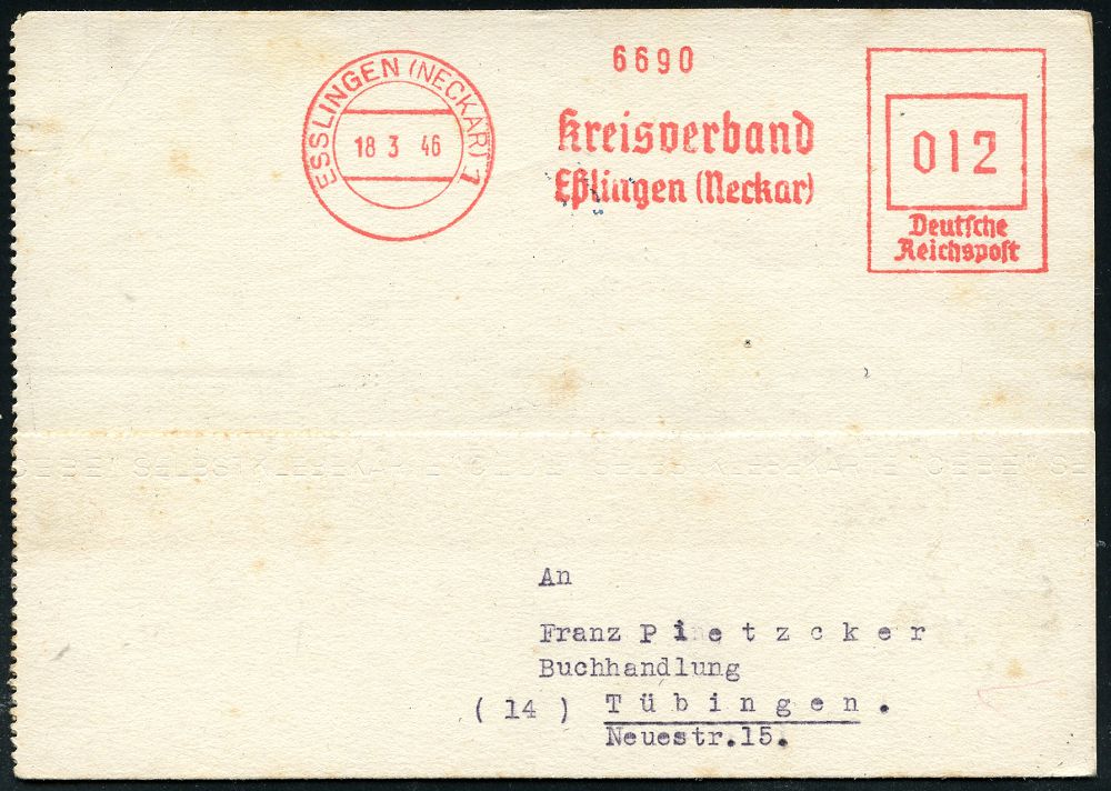 4456 | 35 € | 7300 ESSLINGEN : ESSLINGEN (NECKAR) 1/ Kreisverband/ Eßlingen.. 1946 (18.3.) aptierter AFS Francotyp "Reichsadler" = entfernt = Notmaßnahme! 012 Pf. + rs. US-Zensur-1K: MILITARY CENSORSHIP/ S / CIVIL MAILS (= Esslingen, Rie.A-36 + 300 Pkte.!) seltene Zensur-Kt. n. Tübingen | ![]() ![]() | |