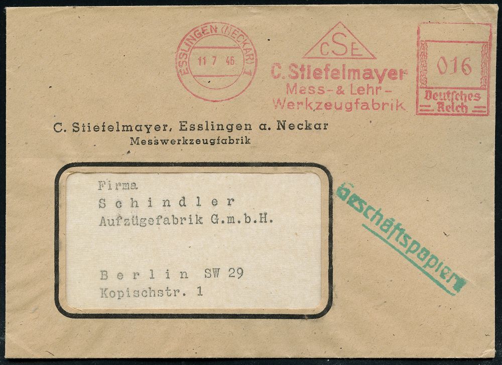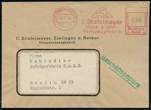 4459 | 30 € | 7300 ESSLINGEN : ESSLINGEN (NECKAR) 1/ CSE/ C.Stiefelmayer/ Mess-& Lehr-/ Werkzeugfabrik 1946 (11.7.) aptierter AFS Francotyp "Hakenkreuz" ) entfernt = Notmaßnahme! (Monogr.-Logo, vergl. Kat.-Nr.4433) Firmen-Fern-Bf. (Dü.E-12 K-98o) | ![]() | |