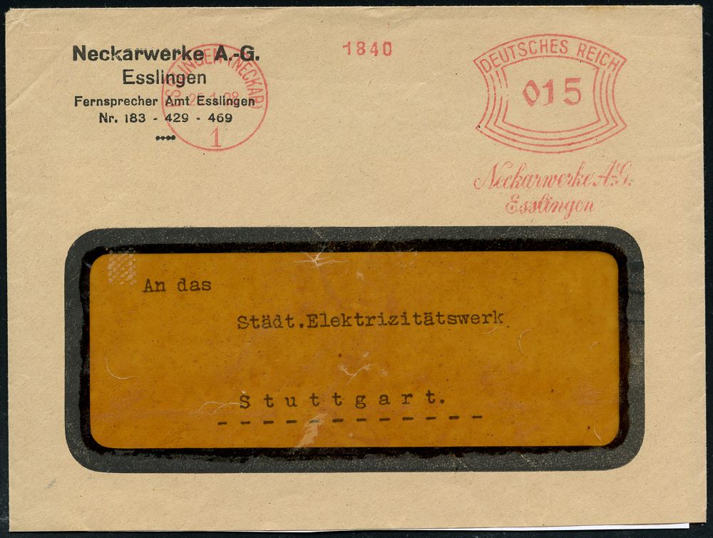4427 | 20 € | 7300 ESSLINGEN : ESSLINGEN (NECKAR)/ 1/ Neckarwerke AG... 1928 (25.1.) AFS Francotyp "Bogenrechteck" auf gering verkürztem Firmen-Bf.: Neckarwerke AG.. (Dü.E-1BAh) | ![]() | |