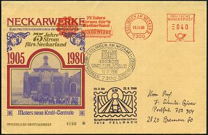 4467 | 15 € | 7300 ESSLINGEN : 7300 ESSLINGEN AM NECKAR 2/ 75 Jahre/ Strom für´s/ Neckarland/ NECKARWERKE 1980 (18.11.) AFS Pitney-Bowes + SSt.: 7300 ESSLINGEN AM NECKAR/ ENERGIE U. PHILATELIE.. (Glübirne) Jubil.-SU.: NECKARWERKE.. 1905 1980 (Dü.E-26 E) | ![]() | |