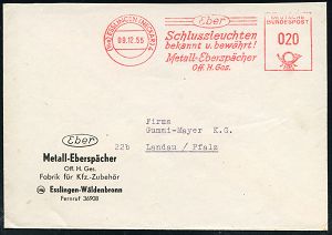 4465 | 12 € | 7300 ESSLINGEN : (14a) ESSLINGEN (NECKAR)/ Eber/ Schlussleuchten/ ..bewährt/ ..Eberspächer 1955 (9.12.) AFS Francotyp "Posthorn" (Logo) motivgl. Firmen-Fern-Bf. (Dü.E-23CO) | ![]() | |