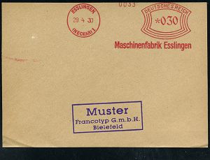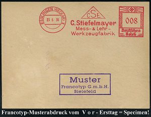 4433 | 35 € | 7300 ESSLINGEN : ESSLINGEN (NECKAR) 1/ CSE/ C.Stiefelmayer/ Mess-& Lehr-/ Werkzeugfabrik 1936 (23.5.) AFS-Musterabdruck Francotyp "Hakenkreuz" (Monogr.-Logo) glasklar gest. Francotyp-Musterabdruck vom V o r - Ersttag! (mit Attest), selten! (Dü.E-3CEo) | ![]() ![]() | |