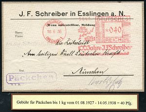 4434 | 25 € | 7300 ESSLINGEN : ESSLINGEN/ (NECKAR) 1/ 1831/ 1931/ 100 Jahre J.F.Schreiber/ Verlag u.Graphische Kunstanstalt 1936 (18.6.) Jubil.-AFS Francotyp "Mäanderrechteck" *040 Pf. (Lorbeer) Päckchen-Adreßaufkleber: J. F. Schreiber.. n. München, seltene Portostufe (Dü.E-2Ah) | ![]() ![]() | |