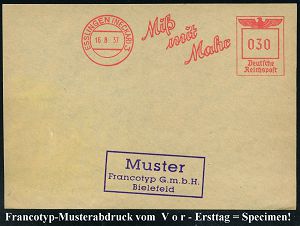 4437 | 35 € | 7300 ESSLINGEN : ESSLINGEN (NECKAR) 1/ Miß/ mit/ Mahr 1937 (16.8.) AFS-Musterabdruck Francotyp "Reichsadler" , glasklar gest. Francotyp-Musterblatt vom V o r - Ersttag! (mit Attest), selten! (Dü.E-5CGo) | ![]() ![]() | |