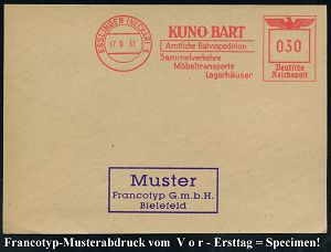 4438 | 35 € | 7300 ESSLINGEN : ESSLINGEN (NECKAR) 1/ KUNO BART/ Amtliche Bahnspedition/ ..Möbeltransporte.. 1937 (17.9.) AFS-Musterabdruck Francotyp "Reichsadler" , glasklar gest. Francotyp-Musterblatt vom V o r - Ersttag! (mit Attest), selten! (Dü.E-5CGo) | ![]() ![]() | |