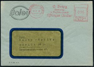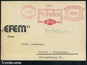 4442 | 15 € | 7300 ESSLINGEN : ESSLINGEN-/ METTINGEN/ Hahrion/ Efem 1937 (9.12.) AFS Francotyp "Bogenrechteck" (Firmen-Logo) klar gest. Firmen-Vorderseite (Dü.E-1CEh) | ![]() ![]() | |