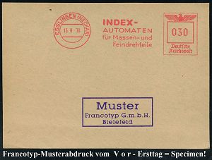 4443 | 35 € | 7300 ESSLINGEN : ESSLINGEN (NECKAR)/ INDEX-/ AUTOMATEN/ für Massen-u./ Feindrehteile 1938 (15.8.) AFS-Musterabdruck Francotyp "Reichsadler" , glasklar gest. Francotyp-Musterblatt vom V o r - Ersttag! (mit Attest), selten! (Dü.E-5CGo) | ![]() ![]() | |