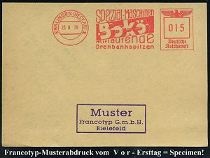 4444 | 35 € | 7300 ESSLINGEN : ESSLINGEN (NECKAR) 1/ Spezial-Maschinen/ Bokö/ ../ Drehbankspitzen 1938 (25.8.) AFS-Musterabdruck Francotyp "Reichsadler" (stilis. Drehbank) glasklar gest. Francotyp-Musterblatt vom V o r - Ersttag! (mit Attest), selten! (Dü.E-5CGo) | ![]() ![]() | |