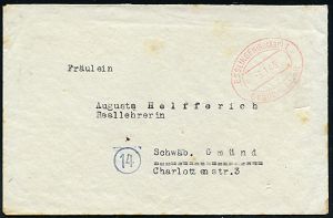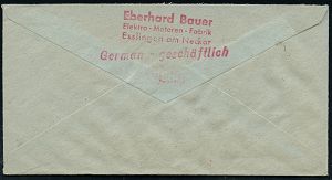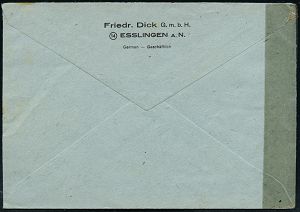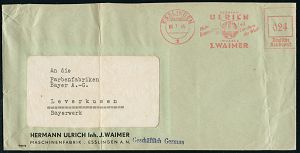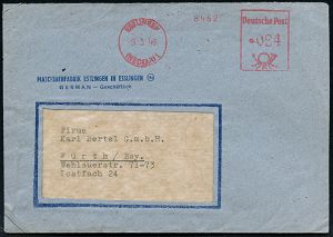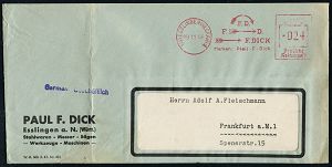 4453 | 20 € | 7300 ESSLINGEN : (14) ESSLINGEN (NECKAR)1/ F.D./ ..F.DICK/ Marken: Preil.. 1946 (29.11.) aptierter AFS Francotyp "Reichsadler" = entfernt = Notmaßnahme! (Firmenlogo: 3 Pfeile) Firmen-Bf.: PAUL F. DICK.. Stahlwaren.. (links gefaltet) (Dü.E-13 A-119o) | ![]() | |