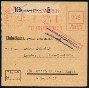 4449 | 30 € | 7300 ESSLINGEN : ESSLINGEN (NECKAR) 1/ HOLZWAREN/ SEIT/ 1871/ FR.PFLEIDERER 1946 (3.1.) aptierter AFS Francotyp "Reichsadler" = entfernt = Notmaßnahme!, 295 Pf. auf schw. Paketzettel: Esslingen (Neckar) 1 + roter Ra. gestrichen, Inl.-Paket-Kt. n. Mühlbühl, seltene Portostufe! (Dü.E-13 J-129o) | ![]() ![]() | |