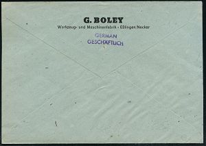 4454 | 30 € | 7300 ESSLINGEN : ESSLINGEN (NECKAR)1/ G.Boley/ Werkzeug=/ u.Maschinenfabrik 1946 (21.8.) seltener, aptierter AFS Francotyp "Hakenkreuz" = Haken-kreuz entfernt = Normaßname , Firmen-Bf.: Boley, rs. Abs.-Vordruck (Dü.E-13 K-98o) | ![]() ![]() | |