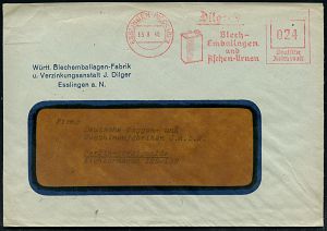 4460 | 25 € | 7300 ESSLINGEN : ESSLINGEN (NECKAR) 1/ Dilger/ Blech-/ Emballagen/ und/ Aschen-Urnen 1946 (5.8.) aptierter AFS Francotyp "Reichsadler" = entfernt = Notmaßnahme! (Blech-Kannister) Firmen-Fern-Bf. (Dü.E-13 J-129o) | ![]() | |