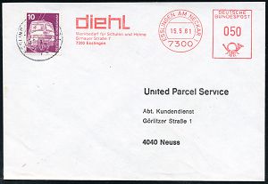 4468 | 10 € | 7300 ESSLINGEN : 7300 ESSLINGEN AM NECKAR 1/ diehl/ Werkbedarf für Schulen u.Heime.. 1981 (15.5.) AFS Francotyp "Posthorn" 050 Pf. + Zusatz-Frankatur 10 Pf. , Fern-Bf. an UPS (Dü.E-26) | ![]() | |
