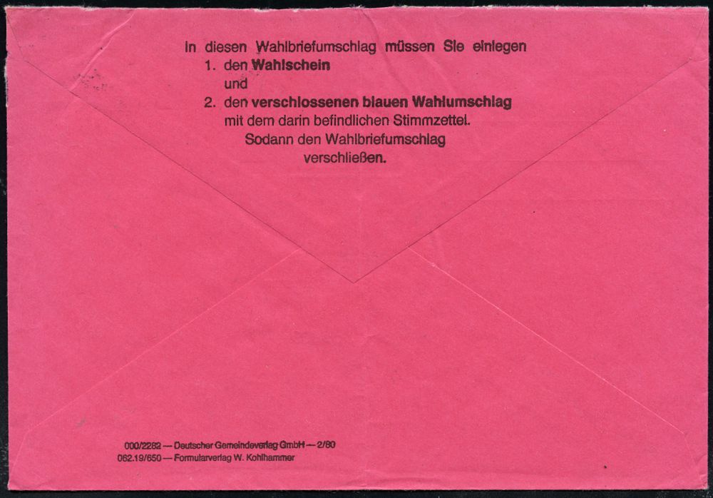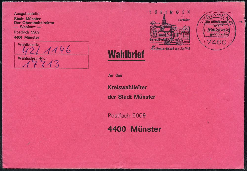 4567 | 14 € | 7400 TÜBINGEN : 7400 TÜBINGEN 1/ mc/ Besucht von aller Welt 1980 (3.10.) MWSt auf portofreiem, rotem "Wahlbrief" für Briefwahl nach Kreiswahlleiter: 4400 Münster (Bo.15 A V) | ![]() ![]() | |