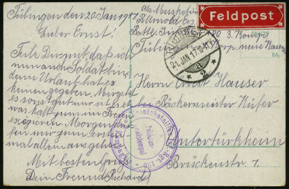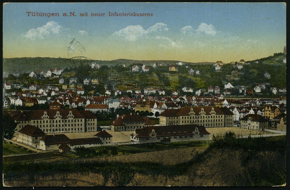 4556 | 14 € | 7400 TÜBINGEN : TÜBINGEN/ *2* 1917 (21.1.) 1K-Gitter auf Color-Foto-Ak.: ..neue Infanteriekaserne = Inf. Rgt. Nr. 180 , roter Feldpost-Aufkleber u. viol. 3K-HdN: Ersatzbataillon Inf.-Rgt. 180, Feldpost-Kt. (n. Untertürkheim) | ![]() ![]() | |