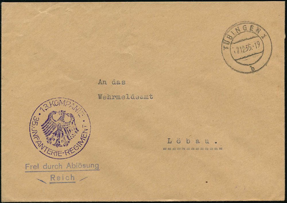4558 | 18 € | 7400 TÜBINGEN : TÜBINGEN 1/ b 1935 (7.12.) 2K-Steg + viol. 1K-Dienst-HdN: 13. KOMPANIE/35. JNFANTERIE-REGIMENT (noch alter Weimarer Adler!, Reichswehr bis 15.3.1935) + bl. 2L: FdA/R, Wehrmachts-Dienstbf. n. Löbau (Einführung Wehrgesetz , "Ariernachweis" am 21.5.1935) | ![]() | |