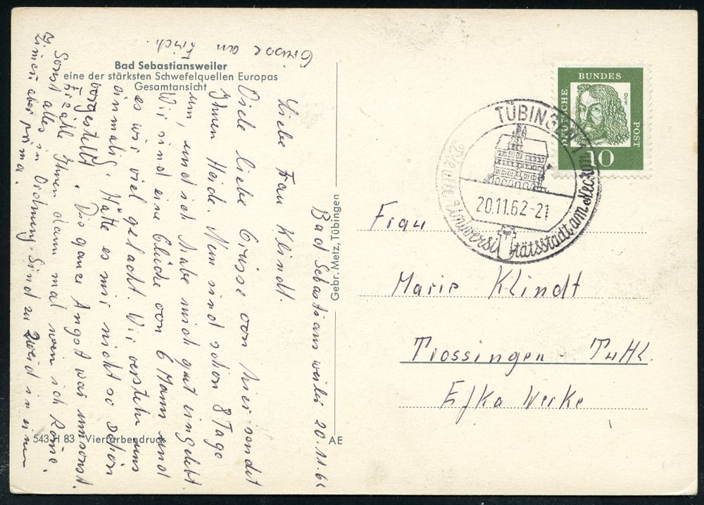 4565 | 14 € | 7400 TÜBINGEN : TÜBINGEN 1/ Die alte Universitätsstadt.. 1962 (20.11.) aptierter HWSt = alte PLGZ enrfernt (Rathaus) klar gest. Bedarfs-Color-Ak.: Bad Sebastiansweiler (Bo.11 Ty.II, aptiert) | ![]() ![]() | |