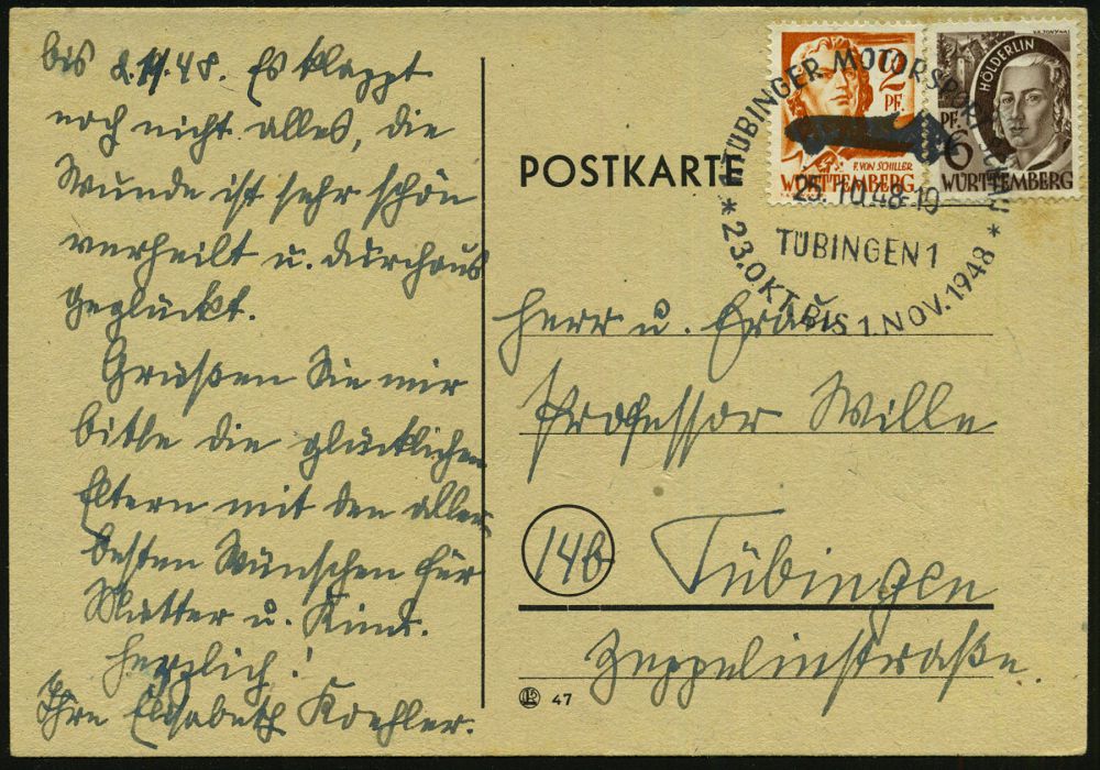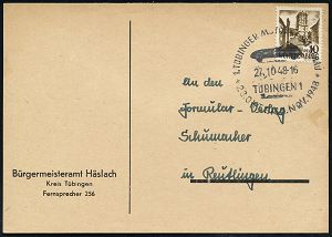 4561 | 16 € | 7400 TÜBINGEN : TÜBINGEN1/ 1.TÜBINGER MOTORSPORT-SCHAU 1948 (27.10.) HWSt = Rennauto , klar gest. Dienst-Kt.: Bürgermeisteramt Häslach.. (Formular-Bestellung) n. Reutlingen (Bo.5 , Type I b) | ![]() ![]() | |