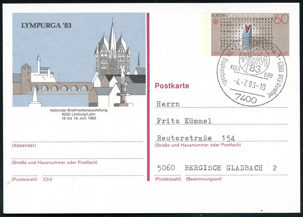 4569 | 6 € | 7400 TÜBINGEN : 7400 TÜBINGEN/ EM´83/ FIBA DBB/ VII.Basketball-Jugend-EM 1983 (4.7.) SSt (Ball als Logo) Inl.-Karte | ![]() | |