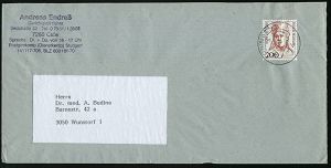 4568 | 14 € | 7400 TÜBINGEN : 74 TÜBINGEN 5/ b 1993 (27.5.) 1K-Segment auf EF 200 Pf. Bertha v. Suttner = Friedens-Nobelpreis 1905 (berühmtes Buch: "Die Waffen nieder!") sauber gest. (Tübingen) Inl.-ZU., seltenes Porto! (Mi.1498 EF) | ![]() | |
