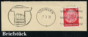 4559 | 18 € | 7400 TÜBINGEN : TÜBINGEN/ =606=/ TÜBINGER/ CHRONIK 1939 (7.3.) seltener Freimarkenstempel = Vorausentwertung durch Frankier- u.Stempelmaschine der Fa. "Telefonbau & Normalzeit" , kleines Briefstück | ![]() | |