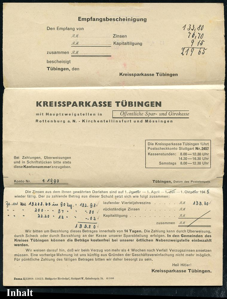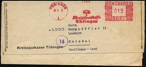 4580 | 35 € | 7400 TÜBINGEN : TÜBINGEN/ 1/ Kreissparkasse 1945 (30.3.) AFS Francotyp "Mäanderrechteck" (stilis. Hermeskopf) sehr später Faltbf. mit Inhalt: Zins-Berechnungen für April 1945 n. Gniebel m. zugestempelter PLGZ 14, Tübingen wurde drei Wochen später am 19.4. besetzt, vergl. Kat.-Nr. 4585 u. 4587 ! (Dü.E-2CEh) | ![]() ![]() | |