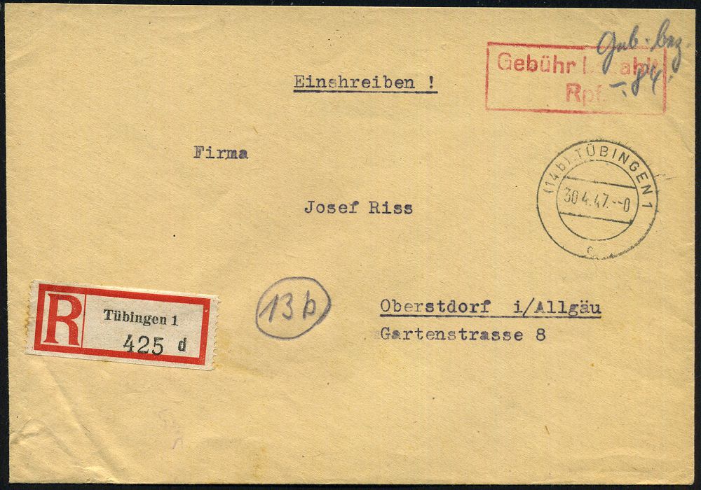 4589 | 15 € | 7400 TÜBINGEN : (14b) TÜBINGEN 1/ c 1947 (30.4.) 2K-Steg + roter Ra.: Gebühr bezahlt/Rpf. + hs. "84" (Pf.) + "Geb. bez." + RZ: Tübingen 1/d , Fern-R-Bf. n. Oberstdorf | ![]() | |
