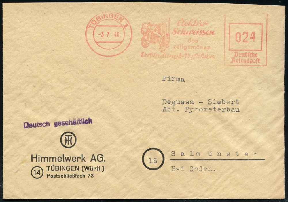 4584 | 25 € | 7400 TÜBINGEN : TÜBINGEN 1/ Elektro-/ Schweissen/ d./ zeitgemässe/ Verbindungs-Verfahren 1946 (3.7.) aptierter AFS Francotyp "Reichsadler" = entfernt = Notmaßnahme! (Elektro-Schweißgerät) Firmen-Bf.: Himmelwerk AG.. (Dü.E-13 J-129o) | ![]() | |