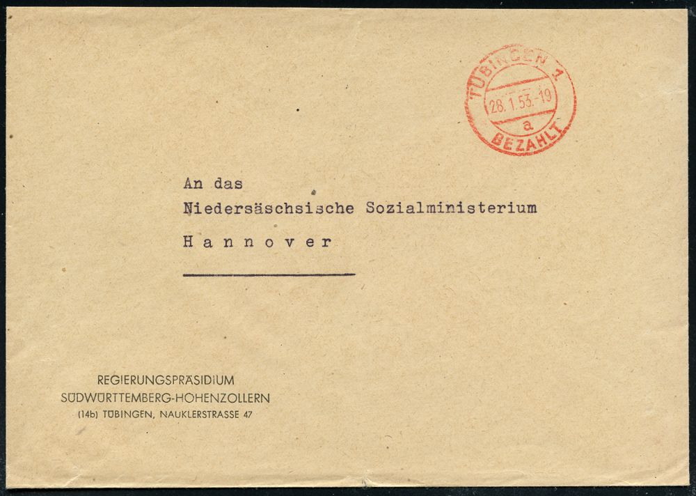 4596 | 12 € | 7400 TÜBINGEN : TÜBINGEN 1/ a/ BEZAHLT 1953 (28.1.) 2K-PFS mit Uhrzeit auf Dienst-Bf: REGIERUNGSPRÄSIDIUM SÜDWÜRTTBG.-HOHENZOLLERN n. Hannover (Dü.A-7, Nr.32 b) | ![]() | |