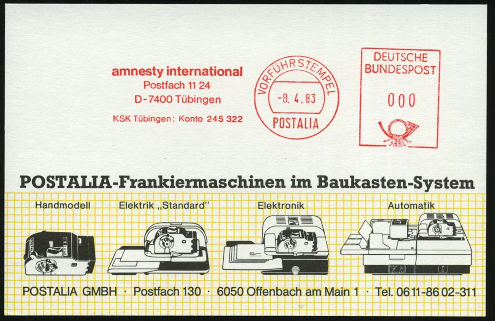 4599 | 16 € | 7400 TÜBINGEN : 7400 Tübingen 1983 (8.4.) AFS: VORFÜHRSTEMPEL/POSTALIA/ amnesty international , seltene Postalia-Musterkt.! (= Specimen) | ![]() | |