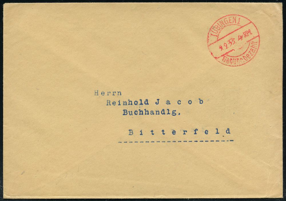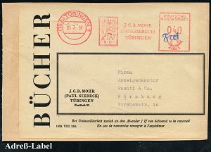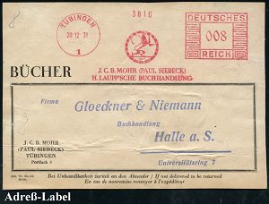 4572 | 20 € | 7400 TÜBINGEN : TÜBINGEN/ 1/ J.C.B.MOHR (PAUL SIEBECK)/ H,LAUPP´SCHE BUCHHANDLUNG 1931 (20.12.) AFS Francotyp "Mäanderrechteck" 008 Pf. (Firmenlogo von 1801) auf BÜCHER-Adreßzettel (natürliche Falte), seltene Portostufe! (Dü.E-2CEh) | ![]() | |