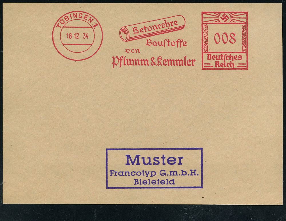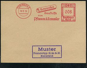 4574 | 35 € | 7400 TÜBINGEN : TÜBINGEN/ Betorohre/ Baustoffe/ von/ Pflumm & Kemmler 1934 (18.12.) AFS-Musterabdruck Francotyp "Hakenkreuz" (Betonrohr) glasklar gest. Francotyp-Musterblatt vom V o r - Ersttag! (mit Attest), selten! (Dü.E-3CEo) | ![]() ![]() | |