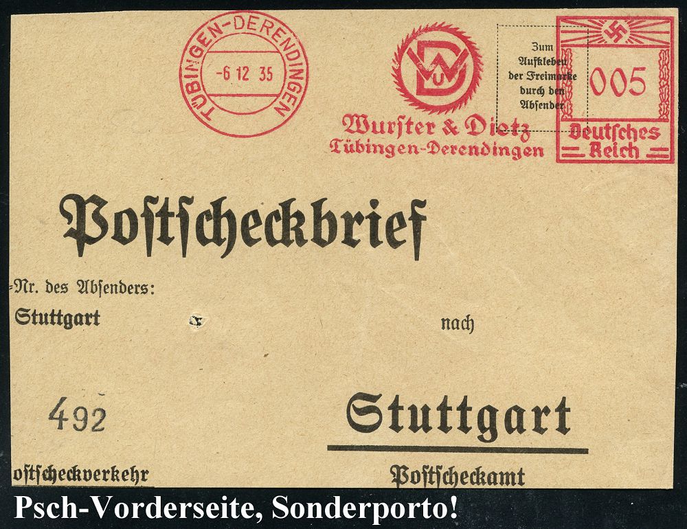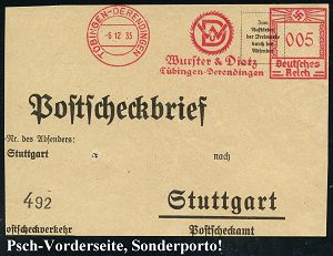 4576 | 18 € | 7400 TÜBINGEN : TÜBINGEN-DERENDINGEN/ Wu/ Wurster & Dietz.. 1935 (6.12.) AFS Francotyp "Hakenkreuz" 005 Pf. Sondertarif (Monogr.-Logo) auf Postscheck-Vorderseite (kl. Kerbe) seltene Portostufe, vergl. Kat.-Nr. 4575 (Dü.E-3CEo) | ![]() | |