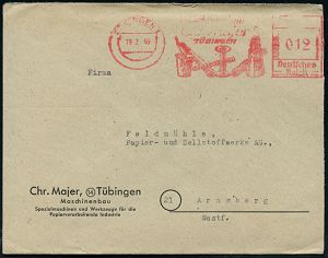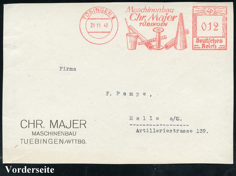 4579 | 16 € | 7400 TÜBINGEN : TÜBINGEN 1/ Maschinenbau/ Chr.Majer.. 1940 (21.11.) AFS Francotyp "Hakenkreuz" (Stanzteile) klar gest. Firmen-Vorderseite (Dü.E-3CEo) | ![]() | |