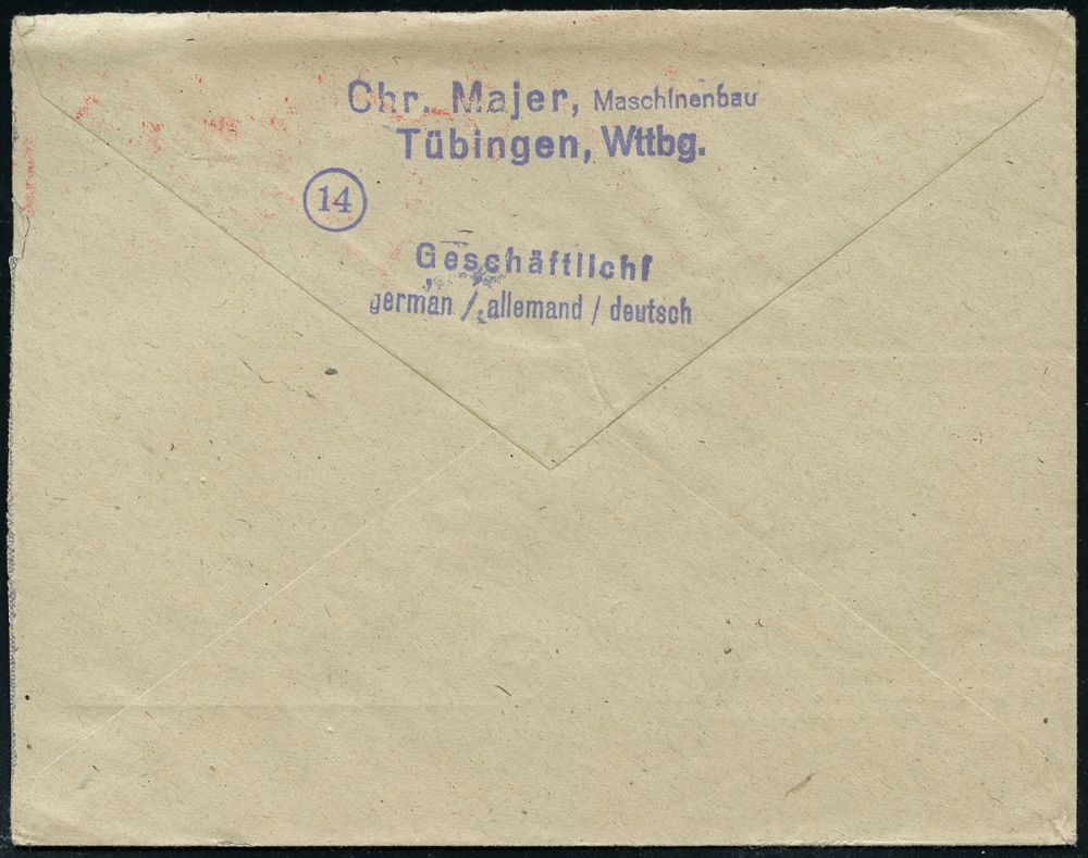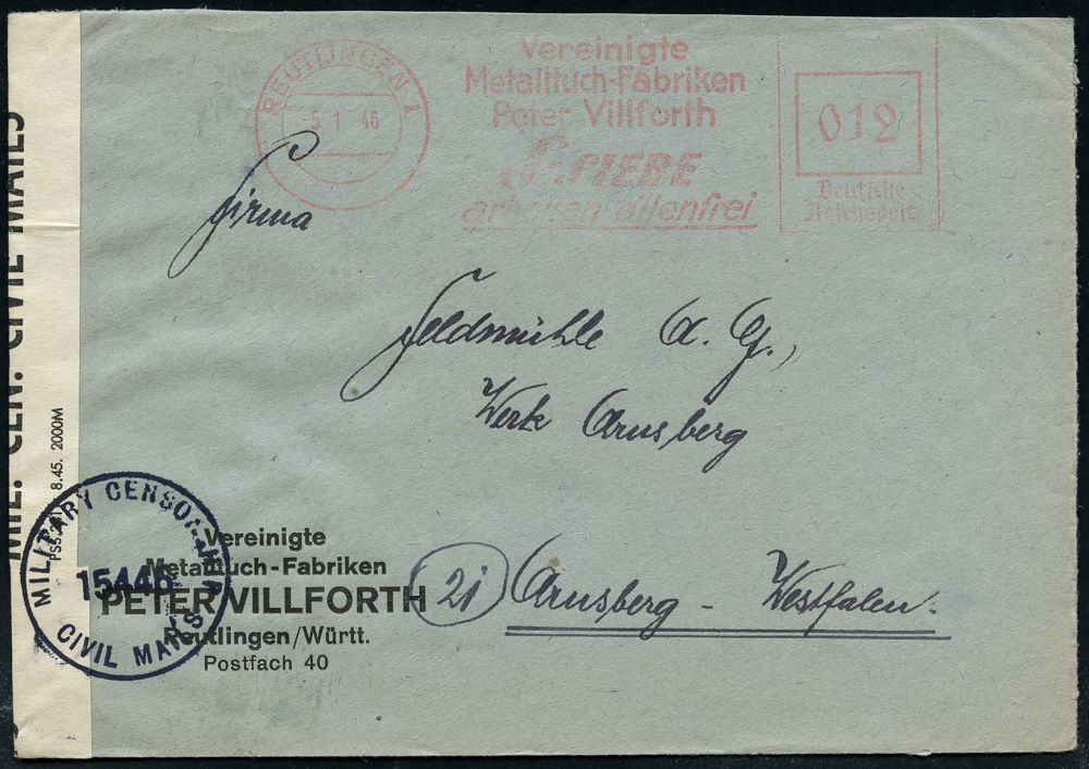 4581 | 35 € | 7400 TÜBINGEN : TÜBINGEN 1/ Vereinigte/ Metalltuch-FABRIKEN/ Peter Villforth.. 1946 (5.1.) aptierter AFS Francotyp "Reichsadler" = entfernt = Notmaßnahme! + doppelter US-Zensurstreifen: OPENED BY/ MIL. CEN.-CIVIL MAILS.. PSS 2411 + schw. Zensur-1K: MILITARY CENSORSHIP/ 15445/ CIVIL MAILS = Esslingen (Rie,A-100 + 50 Pkte. etc.) Inl.-Zensur-Firmen-Bf. n. Arnsberg, Westf. (Dü.E-13 J-127o) | ![]() ![]() | |
