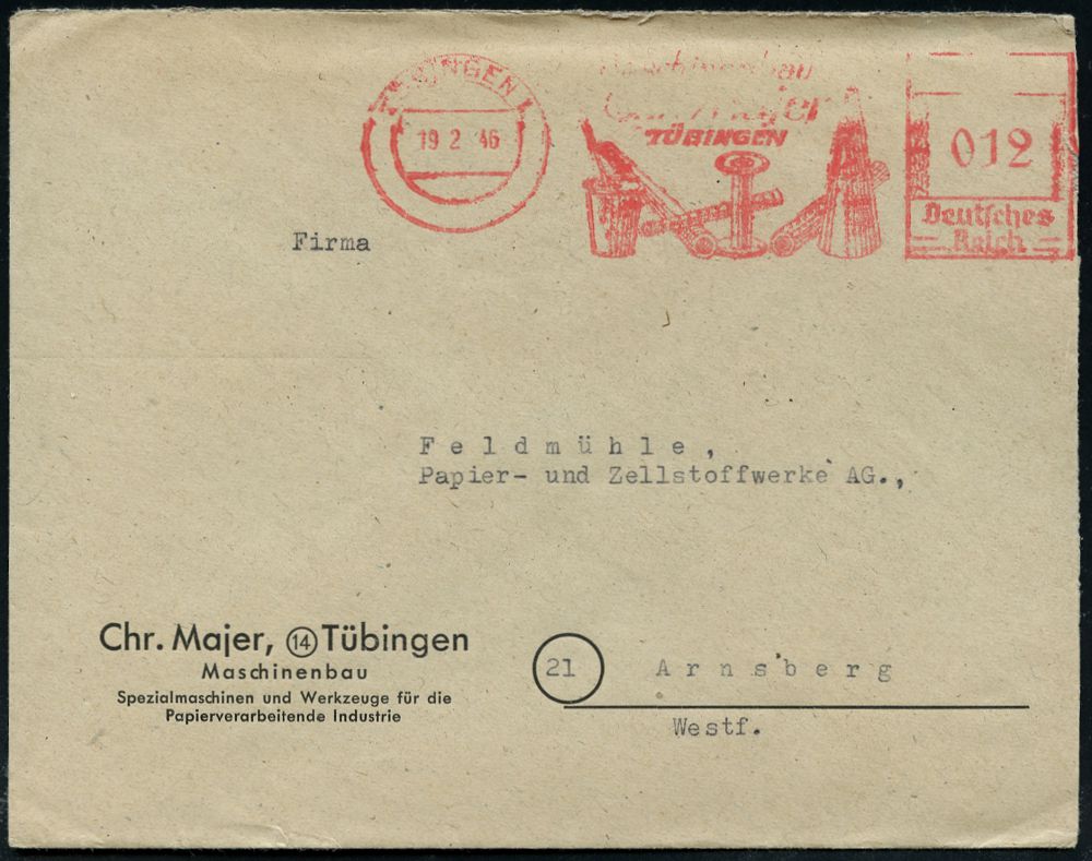 4582 | 22 € | 7400 TÜBINGEN : TÜBINGEN 1/ Maschinenbau/ Chr.Majer.. 1946 (19.2.) aptierter AFS Francotyp "Hakenkreuz" = entfernt = Notmaßnahme! (Stanzteile, teils zeitbedingt etw. undeutl.) Firmen-Bf.: Chr. Majer.. Maschinenbau n. Arnsberg, vergl. Kat.-Nr. 4579 (Dü.E-12 K-98o) | ![]() ![]() | |