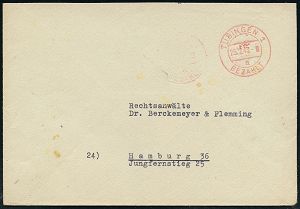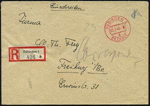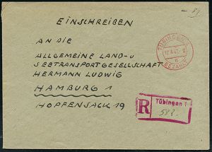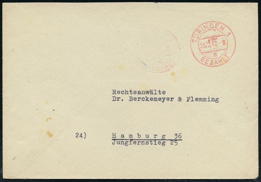 4583 | 15 € | 7400 TÜBINGEN : TÜBINGEN 1/ a/ BEZAHLT 1946 (23.3.) roter 2K-Steg PFS + RZ: Tübingen 1/b (Bf. kl. Seitenriß) klar gest. Fern-R-Bf. n. Freiburg/Br. (Dü.A-7, Nr.32) | ![]() | |