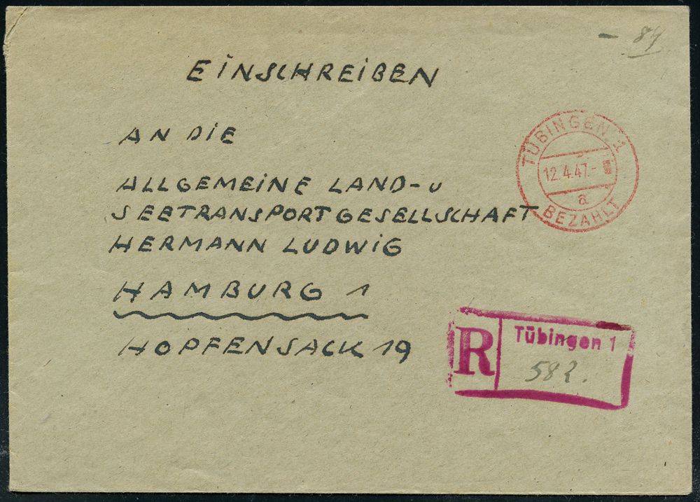 4588 | 16 € | 7400 TÜBINGEN : TÜBINGEN 1/ a/ BEZAHLT 1947 (12.4.) 2K-Steg-PFS mit geblockter Wertziffer u. ohne Uhrzeit + viol. R-Stempel: Tübingen 1 + hs. R-Nr., klar gest. Fern-R-Bf. n. Hamburg (Dü.A-7, Nr.32 b) | ![]() | |