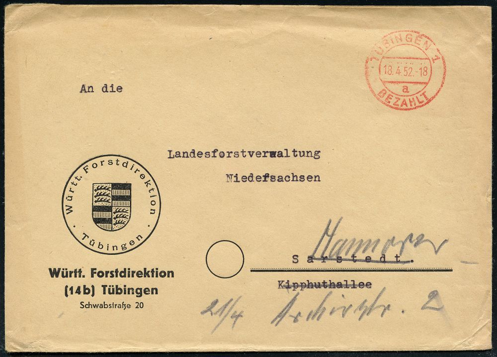 4595 | 12 € | 7400 TÜBINGEN : TÜBINGEN 1/ a/ BEZAHLT 1952 (18.4.) 2K-Steg-PFS ohne Wertziffer mit Uhrzeit auf Dienst-Bf.: Württ. Forstdirektion (14 b) Tübingen,, (Wappen) nachgesandt n. Hannover (Dü.A-7, Nr.32 b) | ![]() | |
