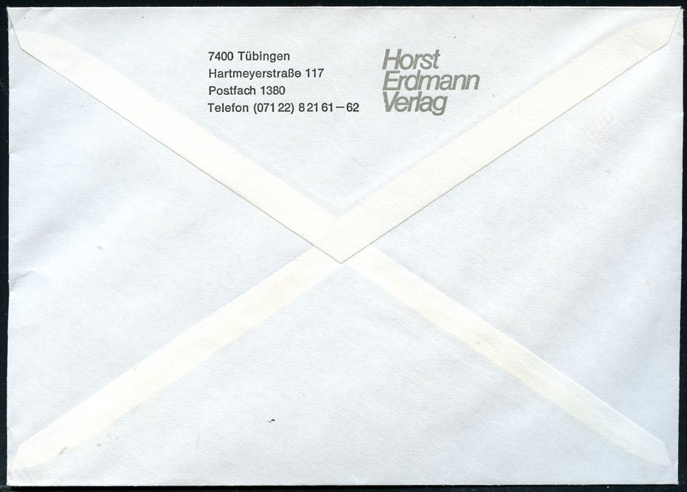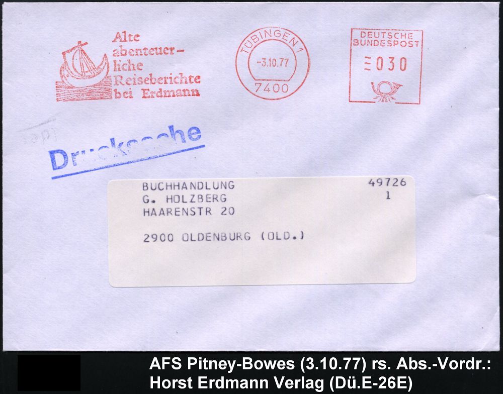 4598 | 10 € | 7400 TÜBINGEN : 7400 TÜBINGEN 1/ Alte/ abenteuer-/ liche/ Reiseberichte/ bei Erdmann 1977 (3.10.) AFS Pitney-Bowes "Posthorn" (histor. Segelschiff) rs. Abs.-Vordruck: Horst Erdmann Verlag.., Fern-Bf. (Dü.E-26E) | ![]() ![]() | |