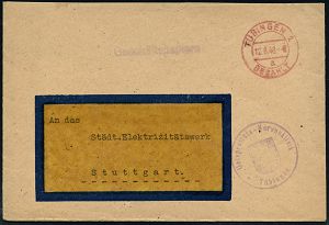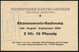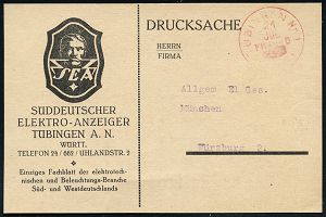 4570 | 25 € | 7400 TÜBINGEN : TÜBINGEN Nr.1/ FRANKO 1921 (21.7.) roter 1K-PFS ohne Jahreszahl auf dekorativer Firmen-Kt.: SÜDDEUTSCHER ELEKTRO-ANZEIGER.. (Logo) = Abo-Rechnung (Dü.A-3) | ![]() ![]() | |
